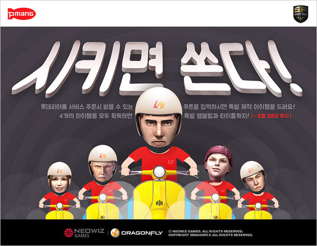 ㈜네오위즈게임즈는 12일 패스트푸드 프랜차이즈 롯데리아와 손잡고 FPS 게임 ‘스페셜포스’ 쿠폰 제휴 이벤트를 진행한다고 밝혔다. ‘스페셜포스’는 게임포털 피망이 서비스하고 ㈜드래곤플라이가 개발한 밀리터리 FPS 게임이다.