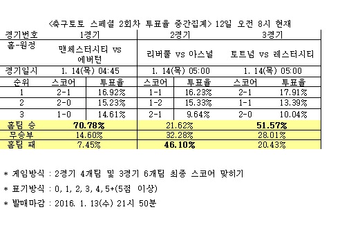잉글리시 프리미어리그 3경기 대상 축구토토 스페셜 2회차 투표율 중간집계 결과