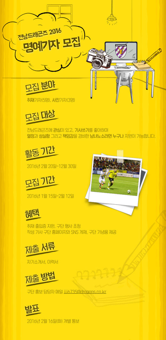 전남 드래곤즈(사장 박세연)가 2016년 선수들의 훈련 및 경기 내용 등을 팬들에게 생생하게 전달하기 위해 제 3기 명예기자를 모집한다.