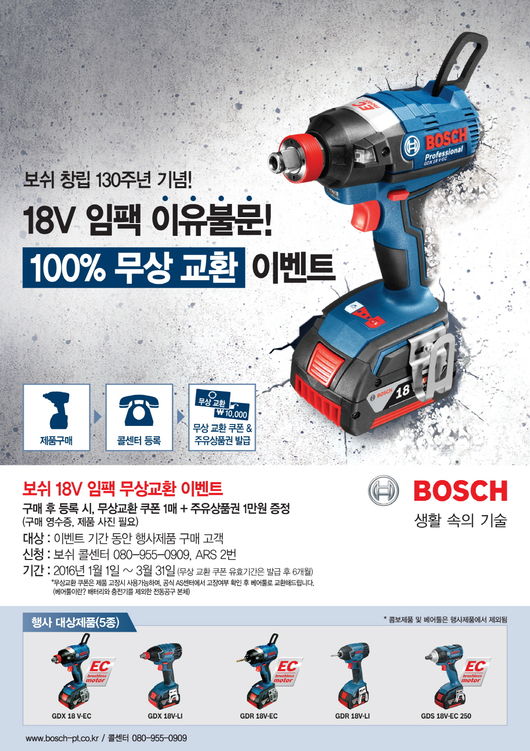 ‘18V 임팩 100% 무상 교환’ 서비스는 오는 3월 31일까지 진행된다. 행사 대상 제품인 임팩 5종 중 한 개라도 구매한 소비자가 보쉬콜센터를 통해 간단한 등록을 마치면, 모바일을 통해 소비자의 과실로 제품에 이상이 생긴 경우에도 새 제품으로 교환할 수 있는 ‘무상교환 쿠폰’과 주유상품권 1만원권이 발급된다. 무상 교환은 쿠폰 발급 후 6개월 이내에 가능하다.