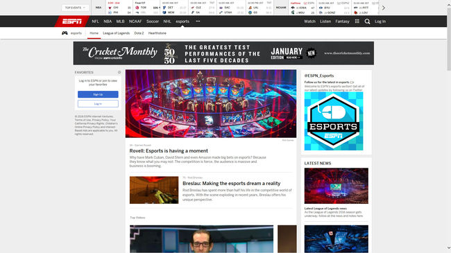 ESPN은 15일 오전(이하 한국시간) e스포츠 섹션을 서비스하기 시작했다. 지난 2015년 6월 지면 매체인 ‘ESPN 더 매거진'을 통해 e스포츠 특집으로 구성하며 ‘새로운 스포츠 종목’으로 부상하고 있는 e스포츠를 심층 소개하면서 LoL e스포츠를 그 대표적인 사례로 기사화한 바 있는 ESPN은 최근 스포츠 전담 부서를 별도로 구성하면서 e스포츠에 대한 준비를 진행했다.