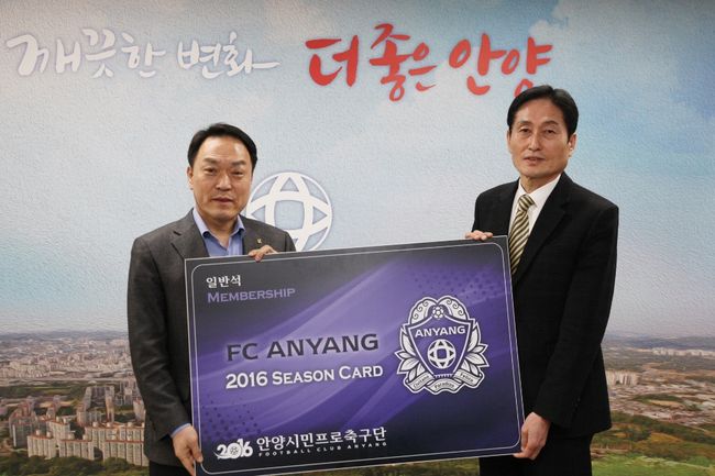 오는 18일부터 2016 FC안양 연간 회원권 판매를 앞둔 FC안양의 이필운 구단주는 지난 14일 오후 안양시청 접견실에서 FC안양 김기용 단장과 구단 관계자들이 모인 가운데 연간 회원권 1호 구매식을 진행했다.