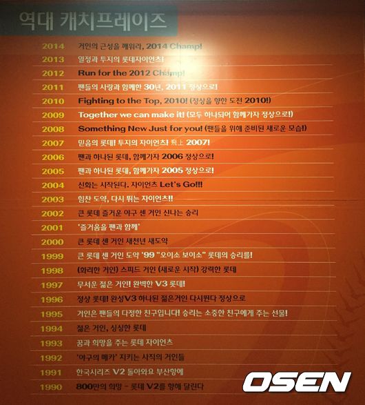 이처럼 캐치프레이즈는 그 해 구단의 방향과 목표를 읽을 수 있는 자료다. 롯데 자이언츠 홈페이지(www.giantsclub.com)에는 2005년부터 작년까지 일목요연하게 정리되어 있다. 또한 자이언츠 박물관 가는 계단에는 1990년부터 정리되어 있어 롯데 역사를 돌아보기에 좋다.