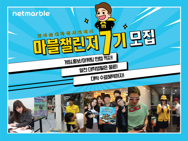 넷마블게임즈(이하 넷마블)는 18일 보도자료를 통해 자사 대학생 서포터즈 '마블챌린저' 7기 모집을 시작한다고 밝혔다.