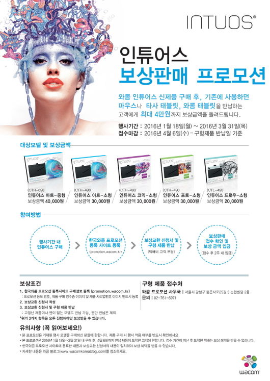 세계적인 태블릿 전문 기업 와콤(Wacom)의 한국법인 한국와콤은 18일부터 오는 3월 31일까지 신제품 인튜어스(Intuos) 모델 대상으로 보상판매 프로모션을 실시한다고 밝혔다.