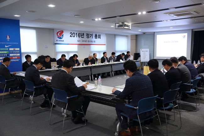 한국프로축구연맹(총재 권오갑, 이하 '연맹')은 18일 서울 종로구 신문로 축구회관 2층 다목적회의실에서 2016년 제 1차 이사회와 정기 총회를 열어 K리그 순위 결정 방식, 2016년 R리그(2군리그) 참가팀과 세부 운영 방안을 확정짓고, 팀명 변경, 임원 유임 및 신임이사 선임, 2016년도 사업계획 및 예산 등의 안건을 심의했다.