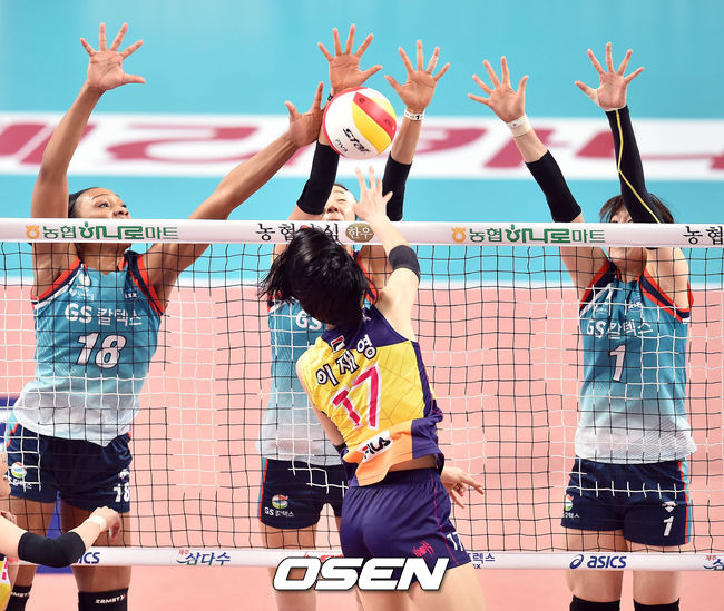 19일 오후 서울 장충체육관에서 열린 '2015-2016 NH농협 V-리그' 여자부 GS칼텍스와 흥국생명의 경기 1세트 흥국생명 이재영의 공격을 GS칼텍스 캣벨, 배유나, 이소영이 블로킹하고 있다.