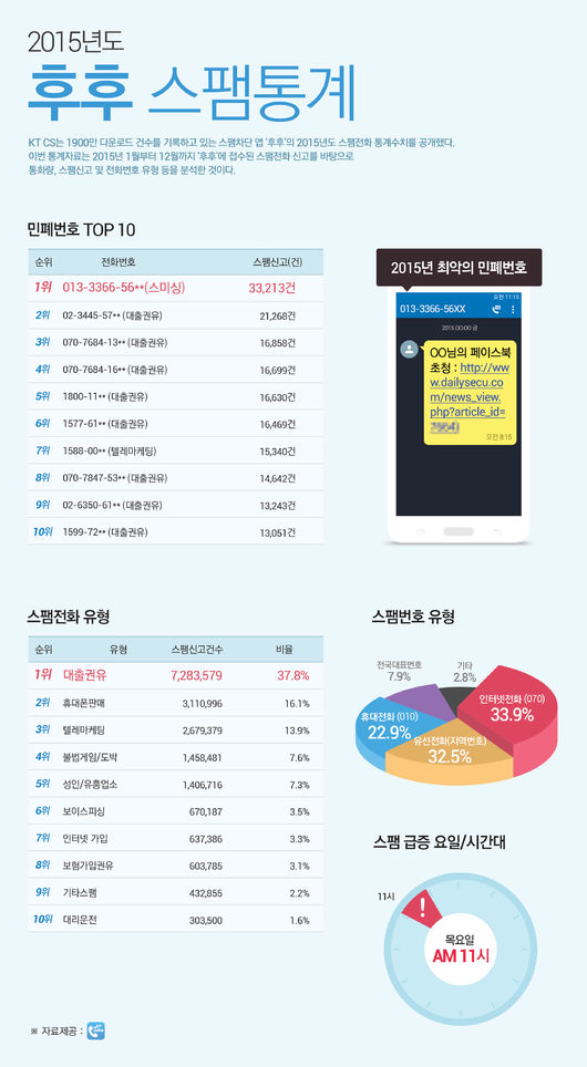 KT CS가 스팸차단앱 후후의 2015년도 스팸신고 통계수치를 공개해 관심을 모았다.