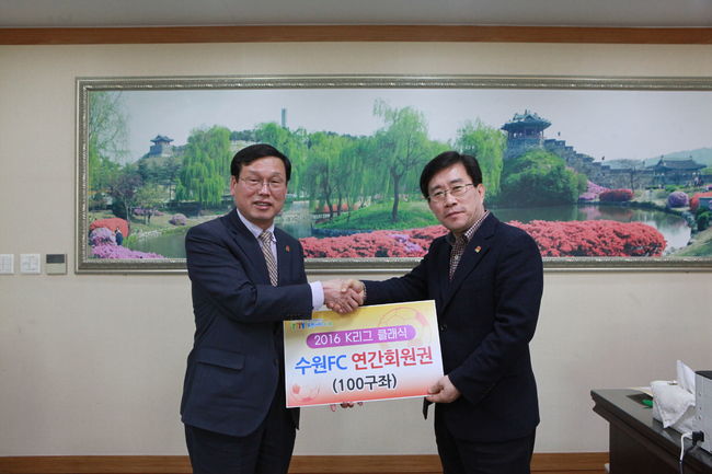 수원 권선구청(구청장 박흥수) 공직자들이 2016년도 수원FC 연간회원권을 구입하며 올 시즌 K리그 클래식에서의 활약을 기원했다.