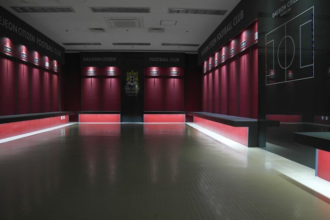 가장 중점을 둔 곳은 라커룸이다. 이번 개편작업은 라커룸이 단순히 선수들이 유니폼을 갈아입고 대기하는 공간이라는 인식에서 벗어나, 경기에 들어서기 전 ‘심기일전’하는 공간이라는 인식에서 착안했다. 라커룸의 내벽을 대전의 상징색인 자주색으로 통일해 전체적으로 통일감을 부여하고, 개개인의 사물함에는 LED조명을 설치해 경기 전 선수들이 몰입도와 집중력을 높일 수 있는 분위기를 조성했다.
