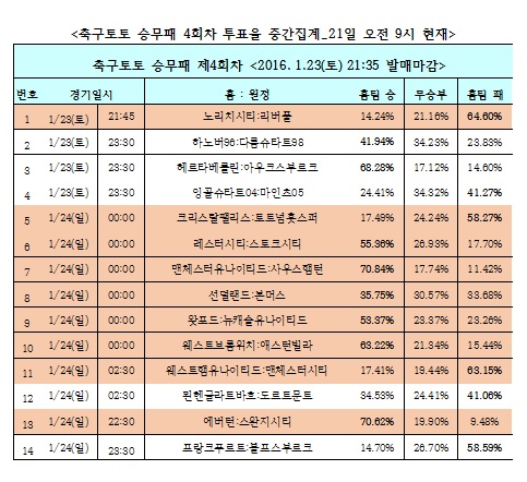 해외 프로축구 14경기 대상 축구토토 승무패 4회차 14경기 투표율 중간집계 결과