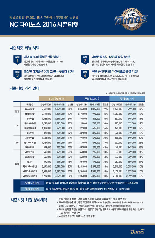 2016년 시즌티켓은 구단 홈페이지(www.ncdinos.com)와 티켓링크(www.ticketlink.co.kr)에서 살 수 있으며, 자세한 내용은 구단 마케팅팀 (055-608-8265)으로 문의하면 된다. /waw@osen.co.kr