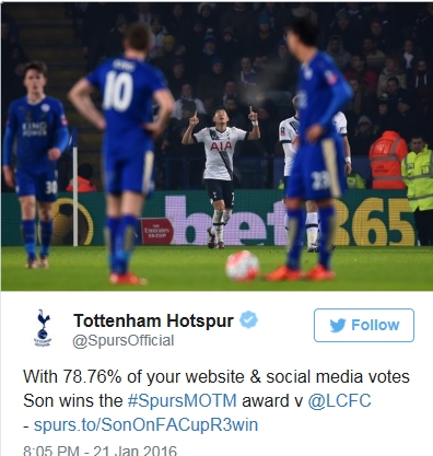 손흥민은 21일(이하 한국시간) 새벽 영국 레스터 킹 파워 스타디움서 열린 레스터 시티와 2015-2016 잉글랜드축구협회(FA)컵 64강 재경기서 결승골을 포함해 1골 1도움을 올리며 2-0 승리를 이끌었다.