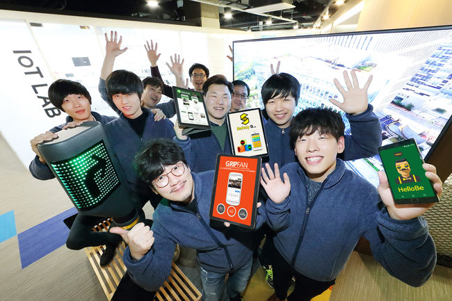 [사진] 공모전 우수팀 대표들이 모여 자신들의 창업 ITEM을 소개하며포즈를 취하고 있는 모습. 앞줄 왼쪽부터 리담알앤피(유승주 대표), 헬로비(김용현 대표), 뒷줄 왼쪽부터 Alt-A(석중호, 이태우 대표), 워키도기(김용재 대표), 세이프티큐랩(이정욱 대표) /KT 제공