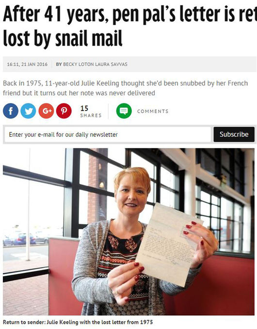 영국 언론 미러는 22일(이하 한국시간) 영국인 줄리 키를링(51)의 사연을 전했다. 줄리는 41년 전인 1975년 1월 당시 프랑스 펜팔친구였던 케시에게 편지를 보냈다. 그러나 줄리는 케시에게 답장을 받지 못하면서 줄리와 케시의 펜팔 관계도 끝났다. 그런데 41년이 지난 후 줄리가 케시에게 보냈던 편지가 반송된 것이다.