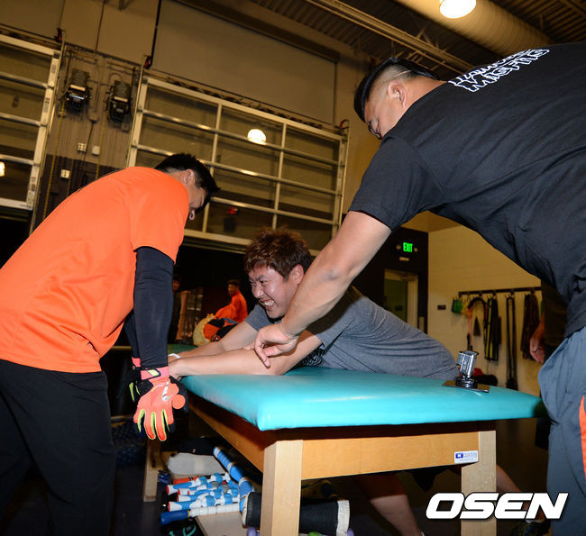 이명우가 장재영 코치의 도움을 받아 근력 운동을 하고 있다.