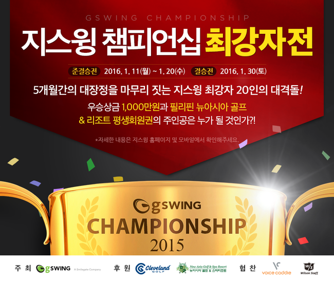 ㈜지스윙은 작년 8월부터 12월까지 5개월 간 진행된 지스윙 챔피언십의 결승전인 ‘2015 지스윙 챔피언십 최강자전’을 오는 30일 수원 아름다운 스크린골프 지스윙 매장에서 개최한다고 밝혔다.