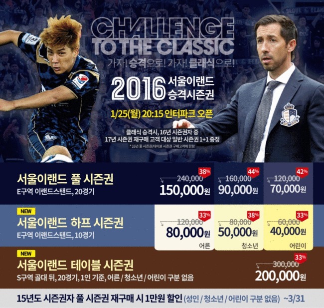 서울 이랜드 FC가 승격에 재도전하는 2016 시즌티켓을 25일 오후 8시 15분부터 인터파크(http://ticket.interpark.com)를 통해 판매 개시한다.
