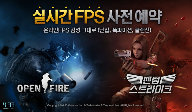 네시삼십삼분(이하 4:33)은 25일, 자사가 서비스 예정인 신작 모바일 FPS ‘오픈파이어’와 ‘팬텀스트라이크’ 2종의 사전예약을 실시한다고 밝혔다.