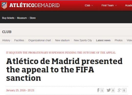 AT 마드리드는 26일(한국시간) 구단 공식 홈페이지를 통해 "우리는 2차례의 이적시장 동안 선수를 등록할 수 없다는 FIFA의 징계에 공식적으로 항소하기로 결정했다"고 밝혔다.
