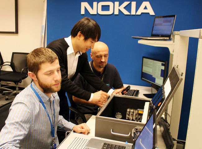 [사진] SK텔레콤과 노키아 기술진이 헝가리 부다페스트에 위치한 노키아연구소에서 일괄통신 기능을 시연하고 있다. /SK텔레콤 제공