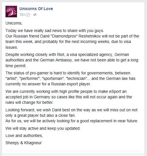 캐나다 e스포츠 전문 매체 '더스코어e스포츠'는 26일(한국시간) 유럽 LoL팀 '유니콘즈오브러브(이하 UoL)'의 정글러 '다이아몬드프록스' 다닐 레셰니코프가 비자 문제로 EU LCS 3주차에 불참하게 됐으며 이후 펼쳐질 모든 경기에도 사실상 참가가 불가능할 것이라고 보도했다.