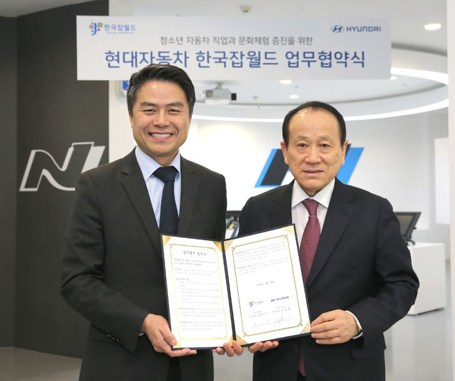 현대자동차(주)는 26일 경기도 성남시 분당구에 위치한 고용노동부 산하 청소년 직업체험관인 한국잡월드 ‘현대자동차관’에서 조원홍 현대차 부사장,장대익 한국잡월드 이사장 등 관계자들이 참석한 가운데 청소년들의 자동차 직업 체험과 문화 체험 증진을 위한 업무 협약식을 진행하고 새단장한 ‘현대자동차관’을 공개했다.