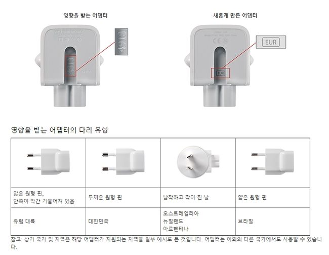 현지 Apple 공인 서비스 제공업체에서 맥, 아이패드, 아이폰 또는 아이팟의 일련 번호를 확인한 후(http://www.apple.com/kr/support/ac-wallplug-adapter/) 교환해주고 있다. /letmeout@osen.co.kr