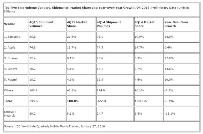 한편 스마트폰은 전 세계적으로 2015년 4분기 3억 9950만개가 팔렸다. 이는 3억 7780만개가 선적된 2014년 동기 대비 5.7%가 성장한 것이다. 2015년 전체로 보면 모두 14억 3290만개가 팔렸다. 역대 가장 많이 팔린 해였다. 13억 170만대가 팔린 2014년에 비해 10.1% 상승했다.