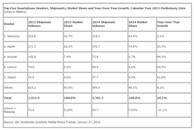 삼성전자는 2015년 전체 시장 점유율은 22.7%를 기록, 24.4%를 차지했던 2014년에 비해 떨어졌다. 하지만 1위 자리는 그대로 유지했다.