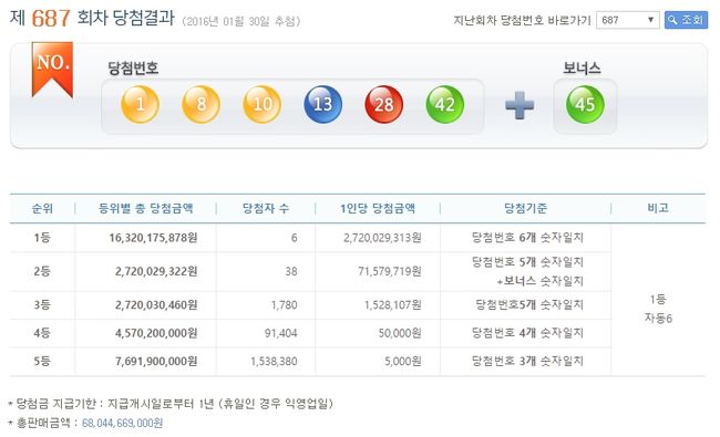 나눔로또는 지난 30일 오후 추첨한 제 687회차 나눔로또 당첨번호 1등이 1, 8, 10, 13, 28, 42번으로 결정됐다고 밝혔다. 보너스 번호는 45번.