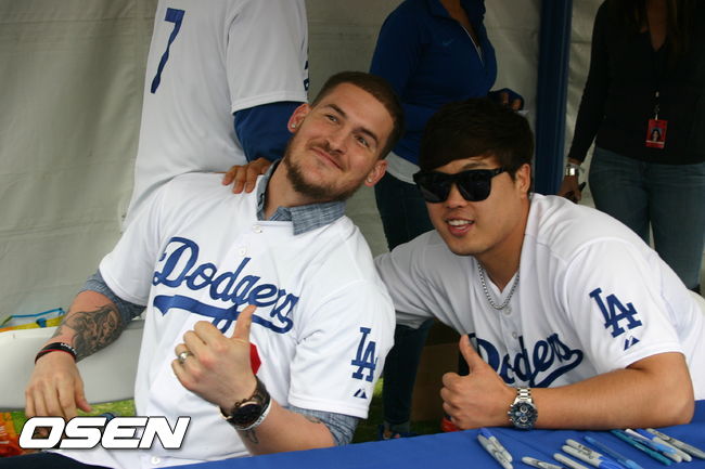 [사진]LA 다저스 류현진(우측)이 31일 열린 팬페스트 행사에서 사인을 시작하기 전 옆자리의 포수 야스마니 그란달과 엄지 손자락을 들어 올리고 있다. /nangapa@osen.co.kr