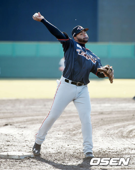 한화 새 외국인 타자 윌린 로사리오(27)가 첫 수비 훈련을 치렀다. 포수 대신 1루수와 3루수로 가볍게 테스트를 받았다.