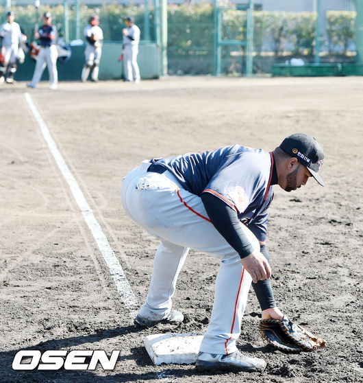 큰 몸집으로 투수들과 내야수들이 던져주는 공을 척척 받아냈다. 태그 동작도 민첩하게 이뤄졌다. 2루와 홈 송구도 빠르고 정확하게 원하는 위치로 던졌다. 첫 단체 훈련이었지만 밝은 표정으로 기합을 넣으며 선수들과 하나로 어울렸다. 2시간30분 정도 이어진 수비 훈련을 무리 없이 마쳤다.