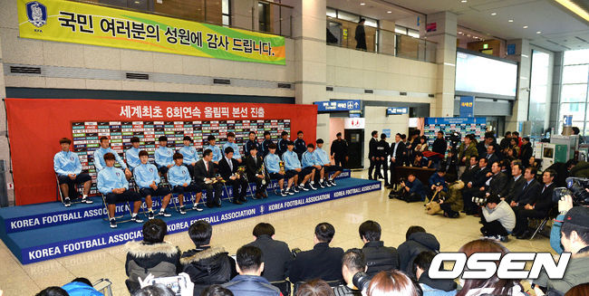 올림픽 축구대표팀은 31일 오후 인천국제공항을 통해 입국장에 모습을 드러냈다. 소속팀으로 곧바로 합류한 황희찬(잘츠부르크), 권창훈(수원) 등 9명을 제외하고 선수 14명과 신태용 감독 및 코칭스태프, 정몽규 대한축구협회장, 이용수 기술위원장 등이 함께 입국장에 나타났다.