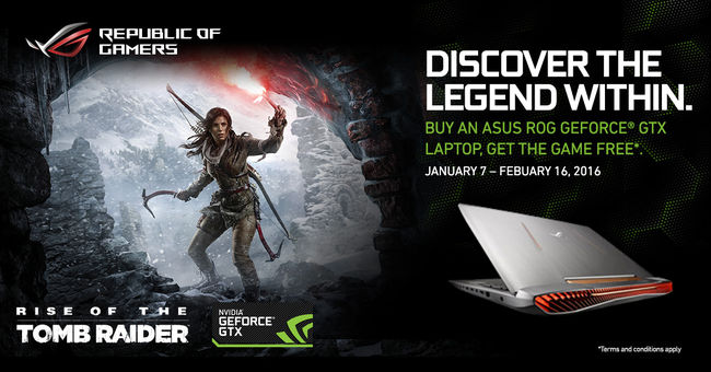 오는 2월 16일까지 에이수스의게이밍 노트북 브랜드 ROG(Republic Of Gamer) 제품 중 GTX 970M, 980M, 980 그래픽 카드가 탑재된 ROG G752VY, G752VT의 제품을 구매하는 소비자는 라이즈오브 더 툼레이더의 정식 한글판 PC 버전을 무료로 다운받을 수 있다. 코드 만료일은 4월 16일이다.