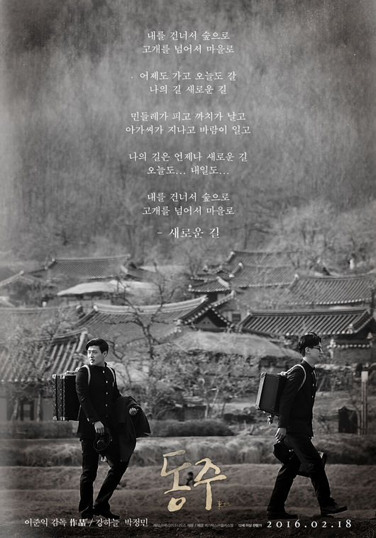'동주'는 이름도, 언어도, 꿈도 허락되지 않았던 1945년, 평생의 친구이자 라이벌이었던 시인 윤동주와 독립운동가 송몽규의 빛나던 청춘을 담은 이야기. 영화 '동주' 측은 2일 윤동주 시인의 아름다운 시들이 생생하게 들리는 듯한 가슴 먹먹한 여운을 담은 특별 포스터를 공개했다.
