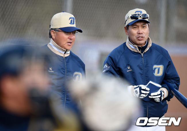 김경문 감독이 훈련을 지켜보며 전준호 코치와 이야기를 나누고 있다.