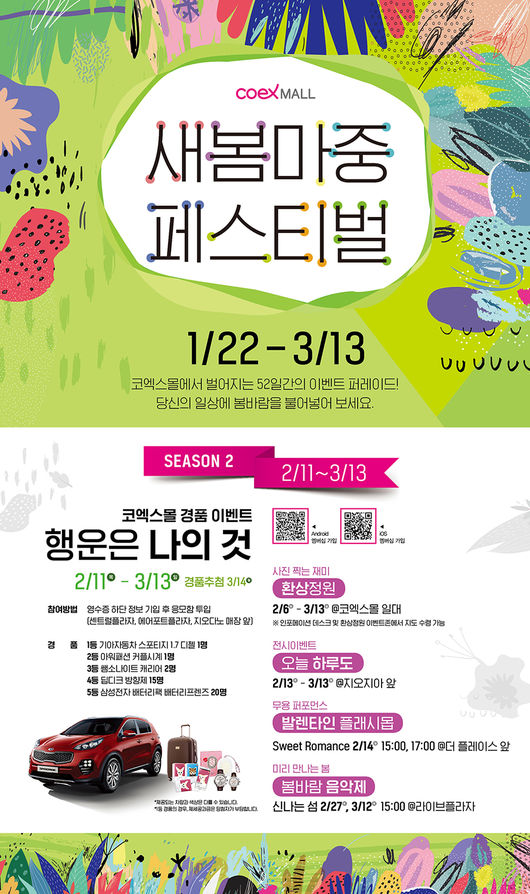 이번 ‘코엑스몰 새봄마중 페스티벌’은 다가오는 봄을 미리 느낄 수 있도록 코엑스몰 곳곳을 화사한 장식물로 단장하고, 대규모 경품행사를 여는 동시에 문화공연, 예술전시, 현장 이벤트 등 문화 콘텐츠와 즐길거리를 선보일 계획이다.