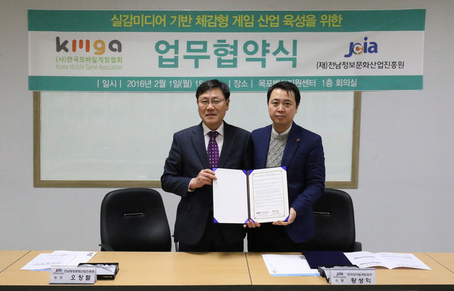 한국모바일게임협회는 1일 목포문화산업지원센터 회의실에서 전남정보문화산업진흥원과 실감미디어, 체감형 게임산업 육성과 활성화를 위한 업무협약(MOU)을 체결했다고 밝혔다.
