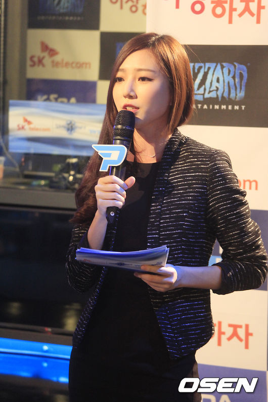 2일 오후 서울 서초 넥슨 아레나에서 'SK텔레콤 스타크래프트2 프로리그' 1라운드 진에어 그린윙스와 MVP 치킨마루의 경기가 열렸다. 스타2 e스포츠 여신인 이현경 아나운서가 양 팀의 경기 시작을 알리고 있다.