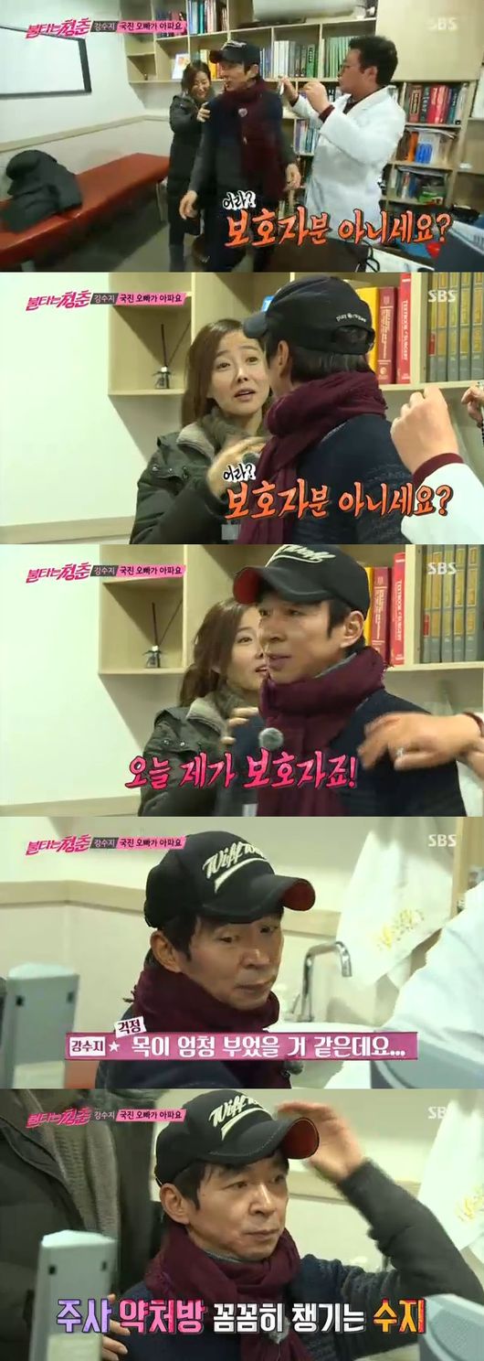 그는 2일 방송된 SBS 예능프로그램 ‘불타는 청춘’에서 목감기가 심해서 강수지와 함께 병원을 갔다.
