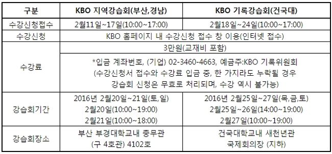 KBO가 야구 공식기록법의 보급과 이해를 통한 저변확대를 목적으로 2016년도(제35회) KBO 기록강습회와 지방 야구팬들을 위한 최초의 지역강습회를 부산에서 개최한다.