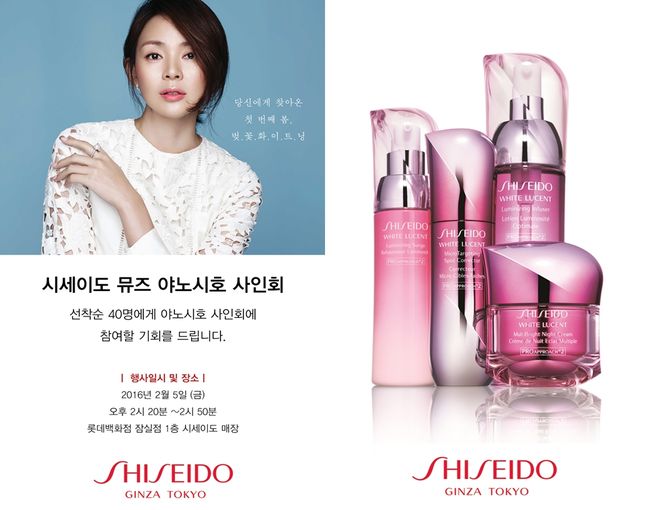 한국 시세이도(SHISEIDO)가 새로워진 화이트닝 신제품 화이트 루센트(WHITE LUCENT) 출시를 기념, 오는 5일, 롯데백화점 잠실점1층 시세이도 매장에서 모델 야노시호의 팬사인회를 진행한다.