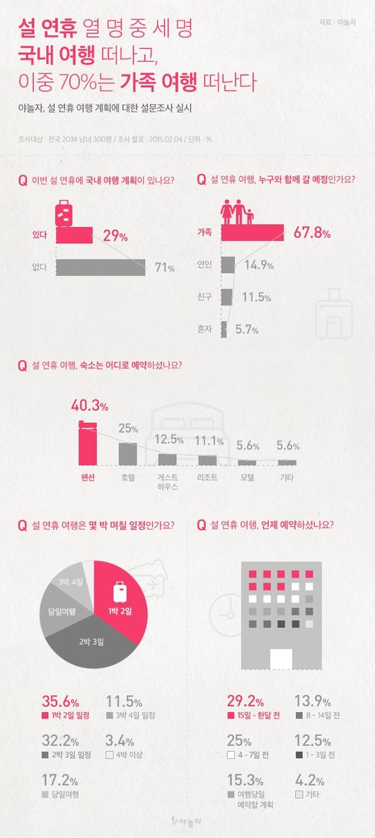 설 연휴 국내 여행에 이용할 숙소에 대한문항에는 40.3%가 ‘펜션’을 꼽았으며, 호텔(25%), 게스트하우스(12.5%)가 뒤를 이었다. 여행 일정은 ‘1박2일(35.6%)’과 ‘2박 3일(32.2%)’로 계획하고 있는 사람이 가장 많았으며, ‘당일여행’이라고 응답한 사람도 17.2%로 드러나 짧은 여행을 계획하는 사람이 많은 것으로 나타났다.