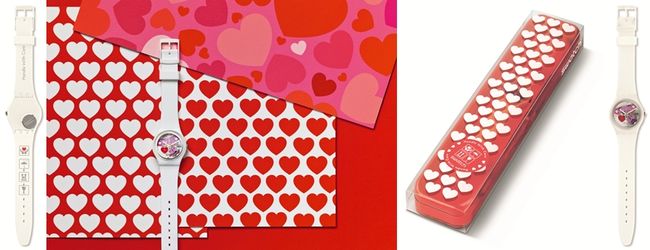 스와치의 밸런타인 데이 스페셜 워치 '텐더 프레젠트'는 다이얼 내부가 들여다 보이는 스켈레톤 디자인의 시계로, 내부 엘레먼트는 핑크와 골드 그리고 레드 하트로 구성되어 사랑스럽고 로맨틱한 분위기를 느낄 수 있다. 올 화이트의 베젤과 스트랩이 깨끗함과 동시에 러블리한 매력을 배가 시켜주는 것이 특징이라고 스와치는 설명했다.