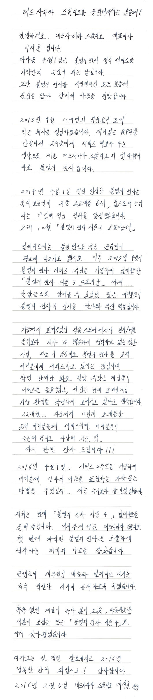 공식 카페와 페이스북을 통해 공개된 자필 편지에는 지난 2013년 9월 스타트업으로 첫 발을 띈 레드사하라 스튜디오의 발자취와 2014년 4월 출시돼 현재까지 약 2년여 간 꾸준히 서비스되고 있는 처녀작 ‘불멸의 전사’에 대한 감회가 담겨있다.