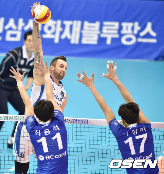 삼성화재는 6일 대전충무체육관에서 열린 '2015-16 NH농협 V리그' 남자부 5라운드 우리카드전에서 세트 스코어 3-1(21-25, 25-20, 25-17, 25-16) 역전승을 거뒀다. 그로저가 백어택 11개, 블로킹 3개, 서브 에이스 3개 포함 35점으로 양 팀 통틀어 최다 득점을 올리며 승리를 견인했다.
