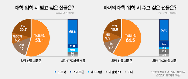 삼성전자 한국총괄은 지난해 9월 대학생 241명과 고등학생 자녀를 둔 부모 153명을 대상 온라인 선물 수요 조사 결과, 학생과 학부모 모두에게서 노트북이 받고 싶은 선물, 주고 싶은 선물 1순위로 뽑혔다고 밝혔다.