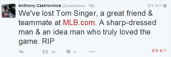 [OSEN= LA(미국 캘리포니아주), 박승현 특파원]지난해까지 MLB.COM 소속으로 피츠버그 파이어리츠를 취재했던 베터런 야구전문기자 톰 싱어가 별세한 것으로 뒤늦게 알려졌다. 11일(이하 한국시간)MLB.COM의 앤소니 카스트로빈스 기자가 이 같은 사실을 알렸다.